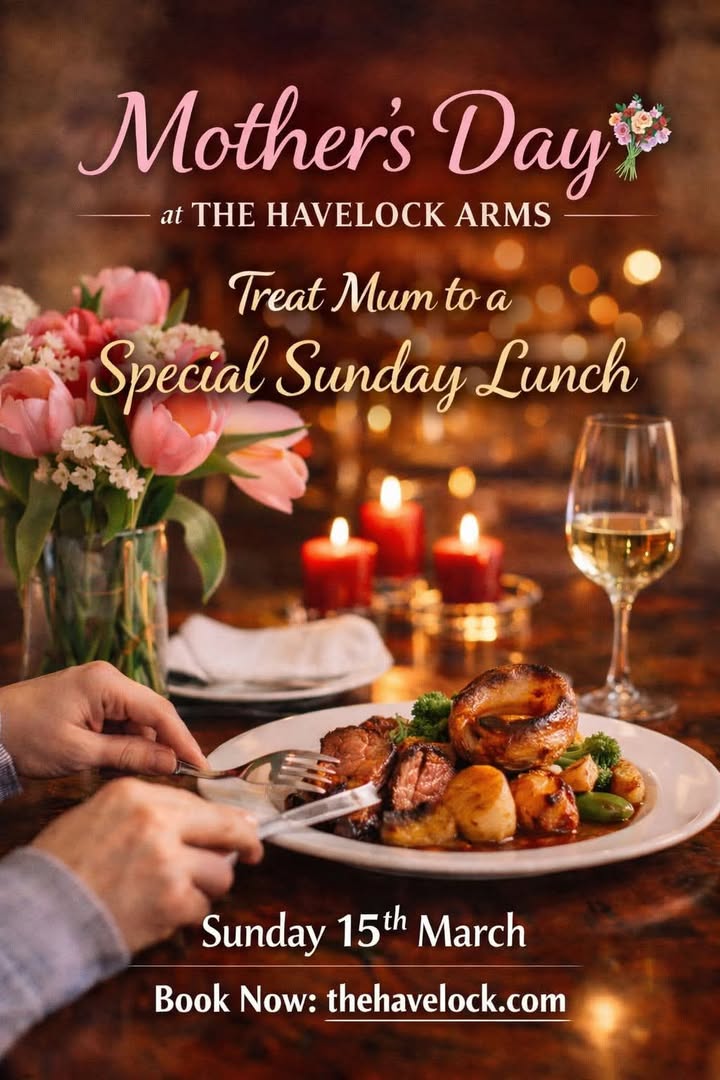 💐 Mother’s Day at The Havelock Arms 💐 💐 15th March 💐 Treat Mam to something special. Enjoy a relaxed, family-friendly meal with great food and even better company. ❤️ ✨ 3 courses for £32 🍽 Freshly prepared dishes 🥂 A perfect way to say thank you 💖 Spaces are limited – booking is strongly recommended. www.thehavelock.com